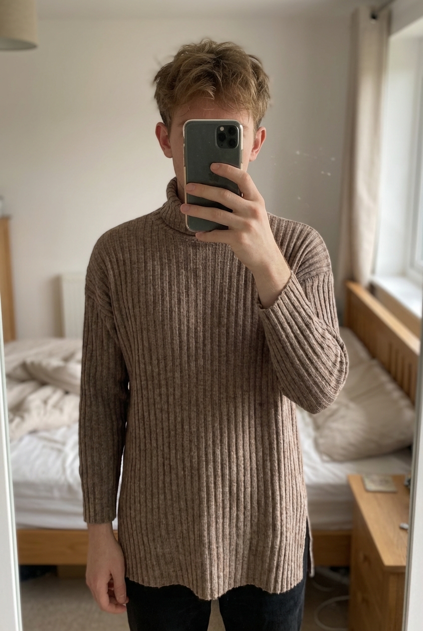 Pull vintage col roulé marron debout, face à la caméra, dans une chambre à la lumière douce, avec une lumière naturelle filtrant par la fenêtre.
