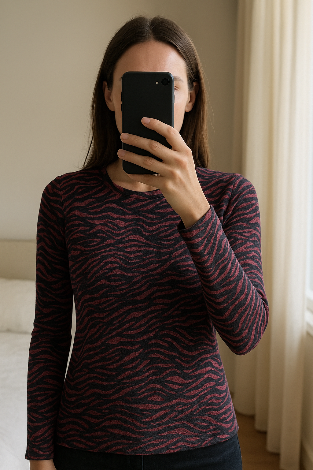 Pull zèbre rouge & noir Zara – Taille M – Tendance & Stylé debout, face à la caméra, dans une chambre à la lumière douce, avec une lumière naturelle filtrant par la fenêtre.