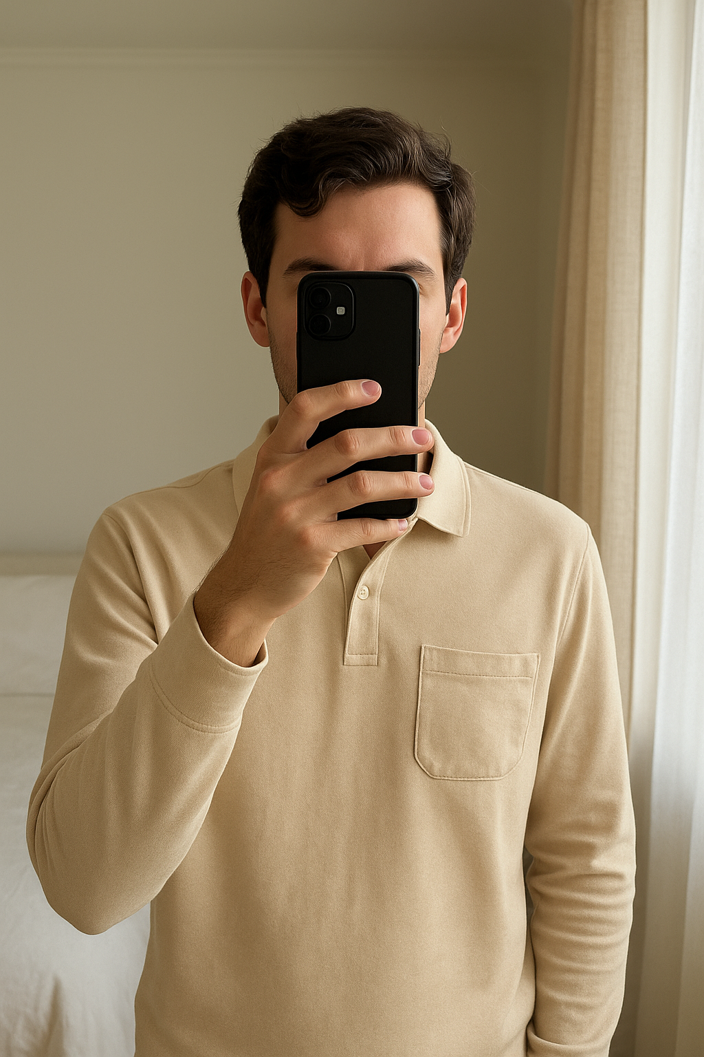 Pull Zara debout, face à la caméra, dans une chambre à la lumière douce, avec une lumière naturelle filtrant par la fenêtre.