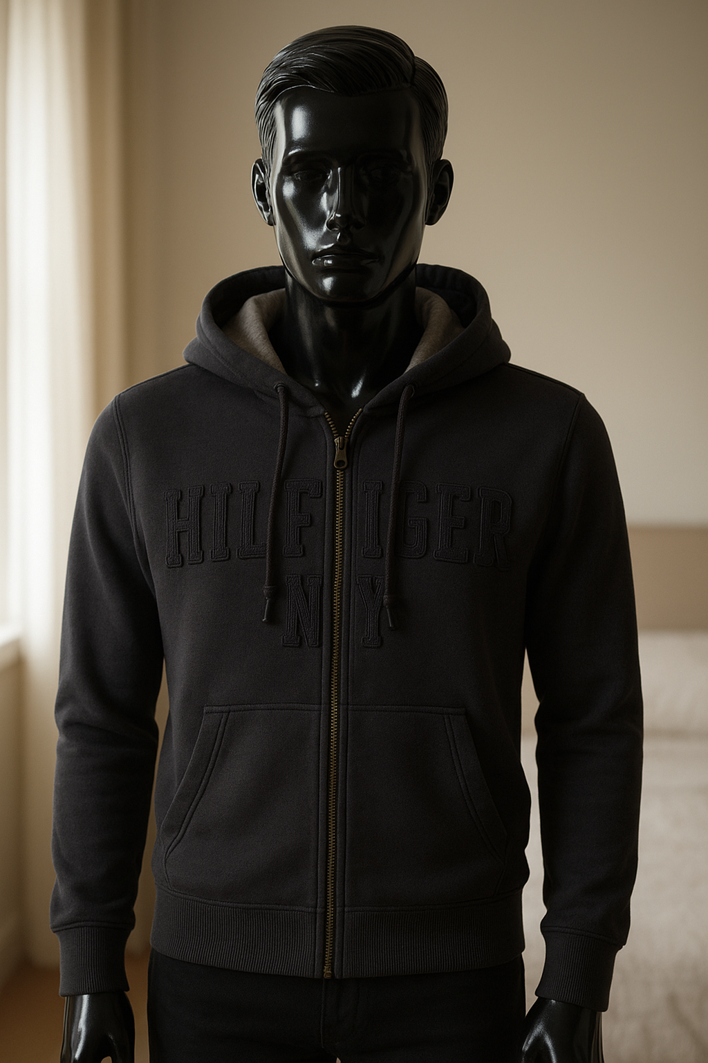 un mannequin noir brillant en plastique, sans traits du visage en Pull à zip capuche Tommy debout, face à la caméra, avec une silhouette fine, dans une chambre à la lumière douce, avec une lumière naturelle filtrant par la fenêtre.