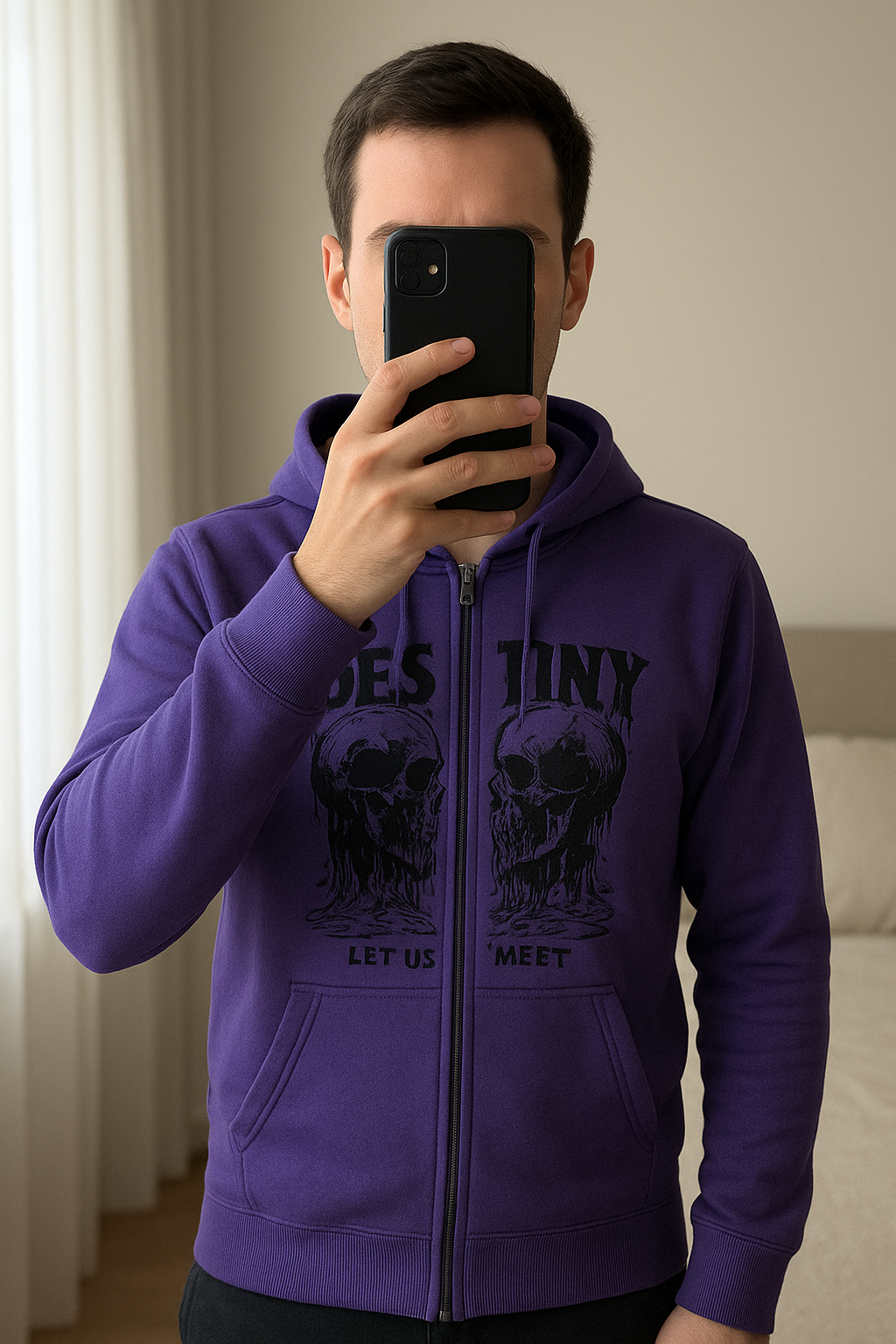 Pull zippé violet et noir M debout, face à la caméra, dans une chambre à la lumière douce, avec une lumière naturelle filtrant par la fenêtre.