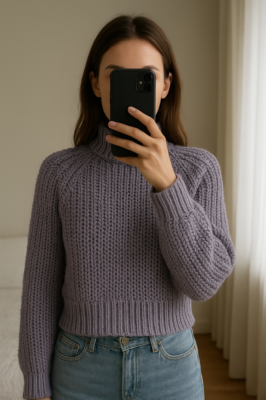 Purple Knitted High-Neck Jumper – standing straight facing the camera, in a softly lit bedroom setting, with gentle natural light filtering through a window.