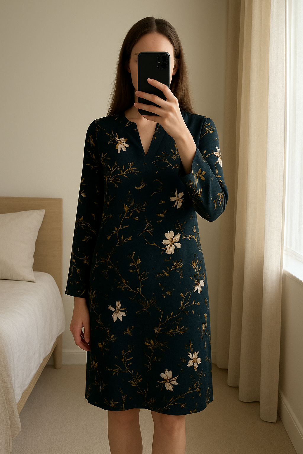 Robe AKOZ de toi 🍃 debout, face à la caméra, dans une chambre à la lumière douce, avec une lumière naturelle filtrant par la fenêtre.