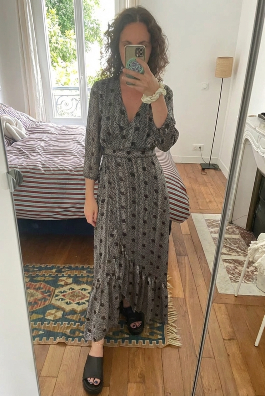 Robe ba&sh debout, face à la caméra, dans une chambre à la lumière douce, avec une lumière naturelle filtrant par la fenêtre.
