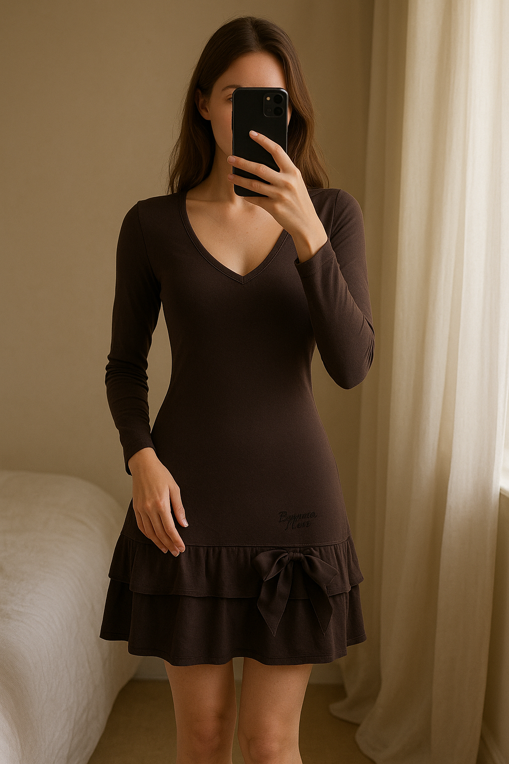 Une personne en Robe Banana Moon cambrant légèrement le dos pour une pose dynamique, avec une silhouette fine, dans une chambre à la lumière douce, avec une lumière naturelle filtrant par la fenêtre.