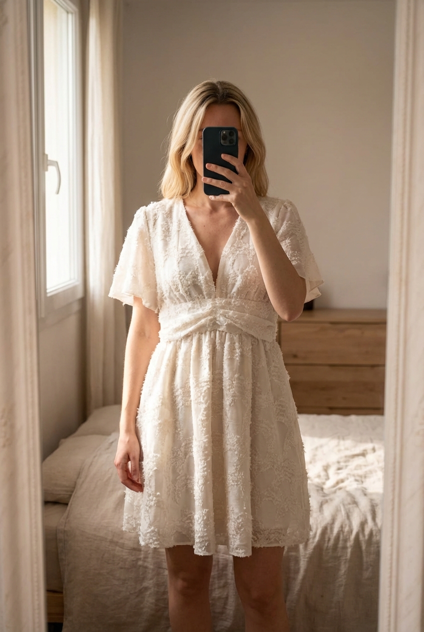 Robe beige femme 40 H&M debout, face à la caméra, dans une chambre à la lumière douce, avec une lumière naturelle filtrant par la fenêtre.
