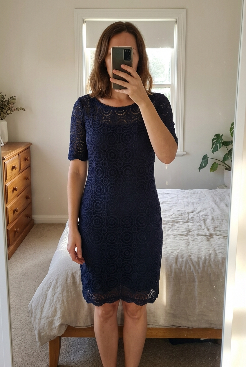 Une personne en Robe bleu marine dentelle Armand Thiery debout, face à la caméra, dans une chambre à la lumière douce, avec une lumière naturelle filtrant par la fenêtre.