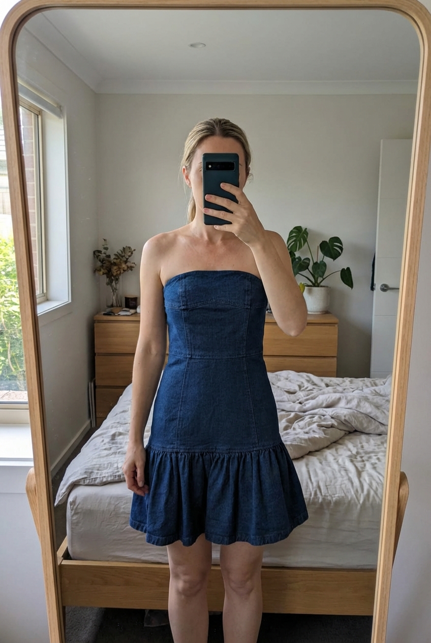 Robe bustier Jean Maje debout, face à la caméra, dans une chambre à la lumière douce, avec une lumière naturelle filtrant par la fenêtre.