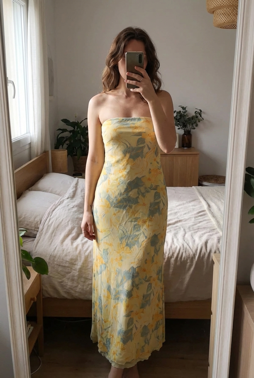 Robe bustier Zara fleurie debout, face à la caméra, dans une chambre à la lumière douce, avec une lumière naturelle filtrant par la fenêtre.