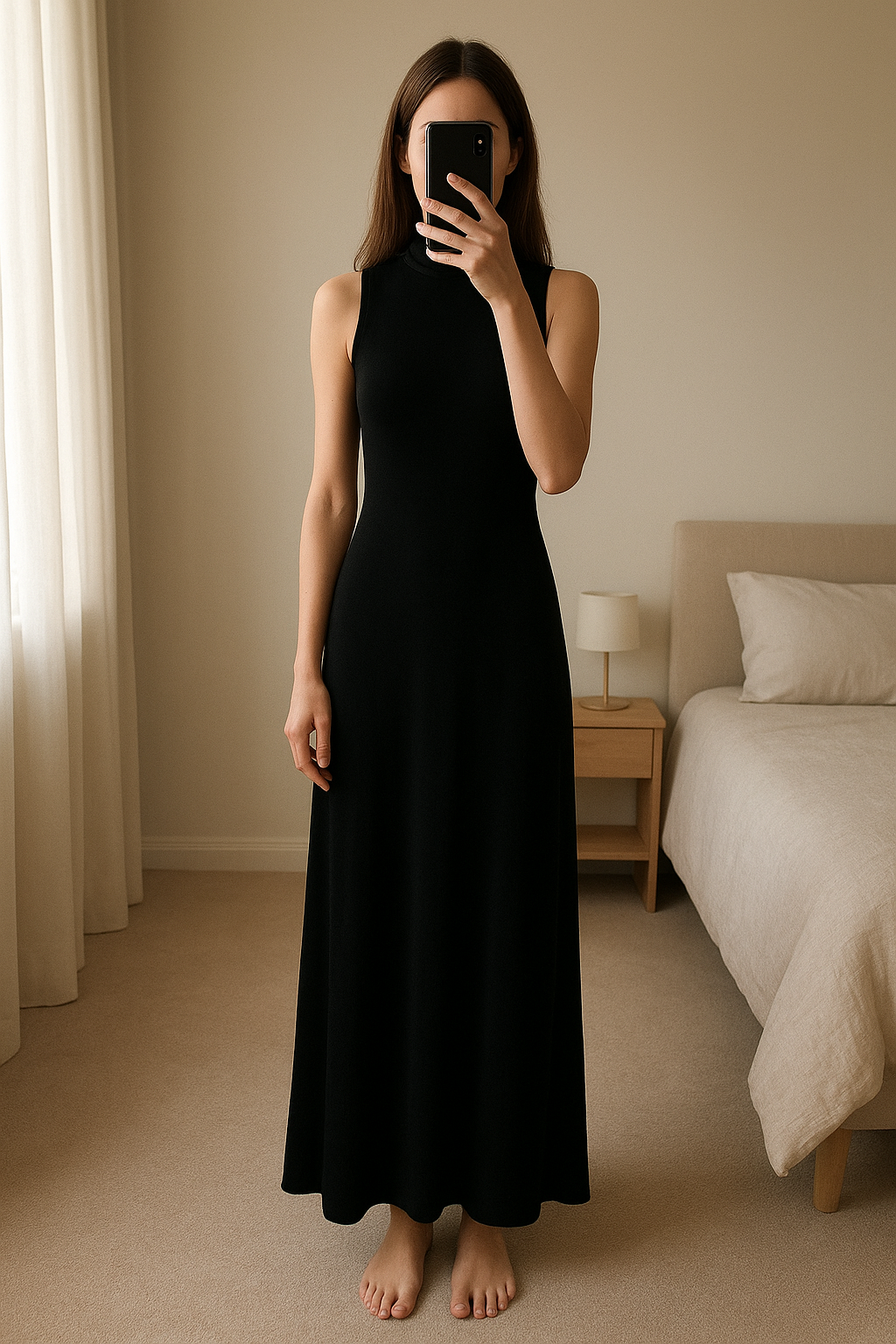 Robe Col Roulé Sans Manches Zara Taille M debout, face à la caméra, dans une chambre à la lumière douce, avec une lumière naturelle filtrant par la fenêtre.