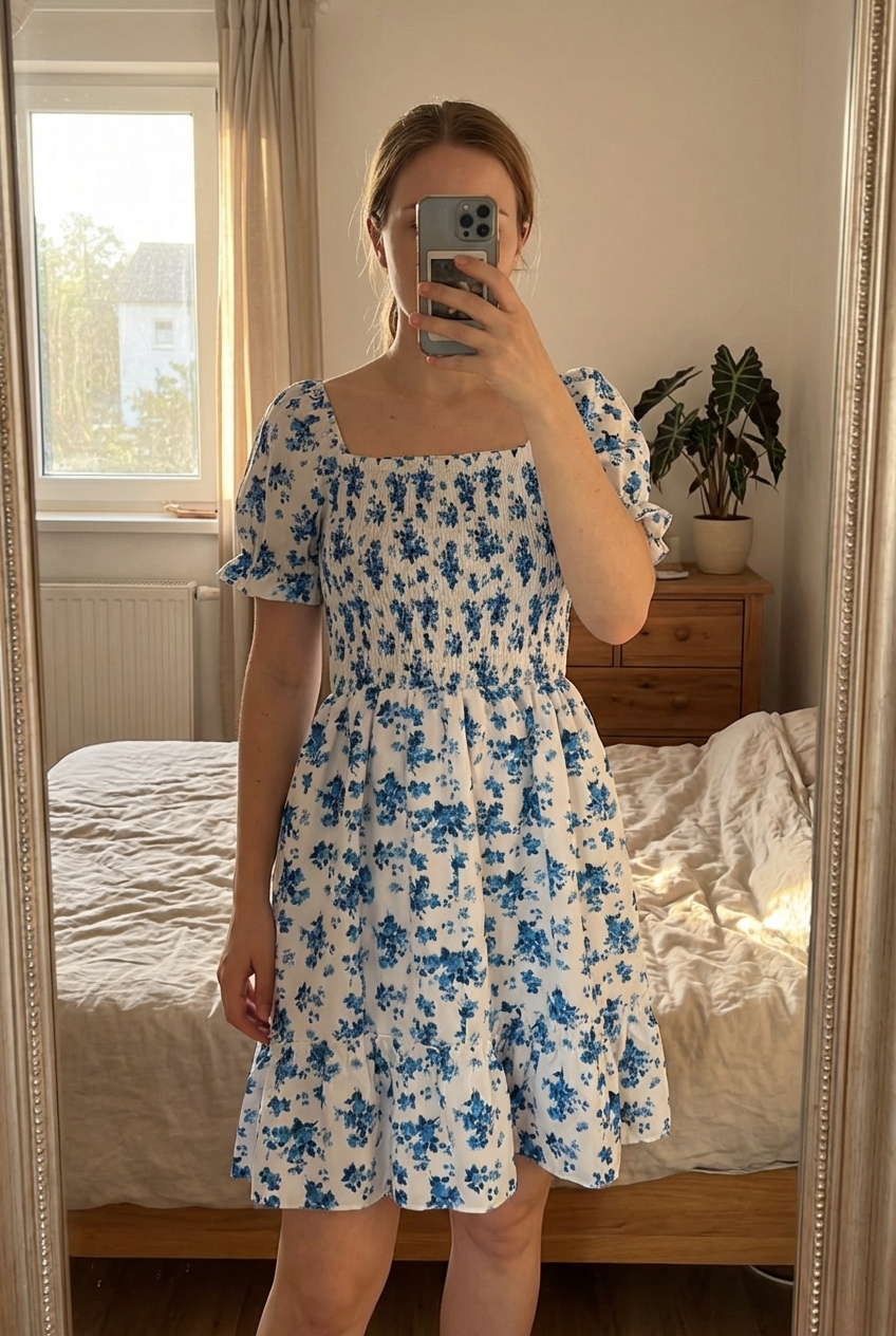 Une personne en Robe courte élégante à fleurs debout, face à la caméra, dans une chambre à la lumière douce, avec une lumière naturelle filtrant par la fenêtre.