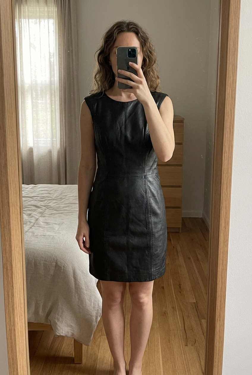 Robe cuir mango noire S debout, face à la caméra, dans une chambre à la lumière douce, avec une lumière naturelle filtrant par la fenêtre.