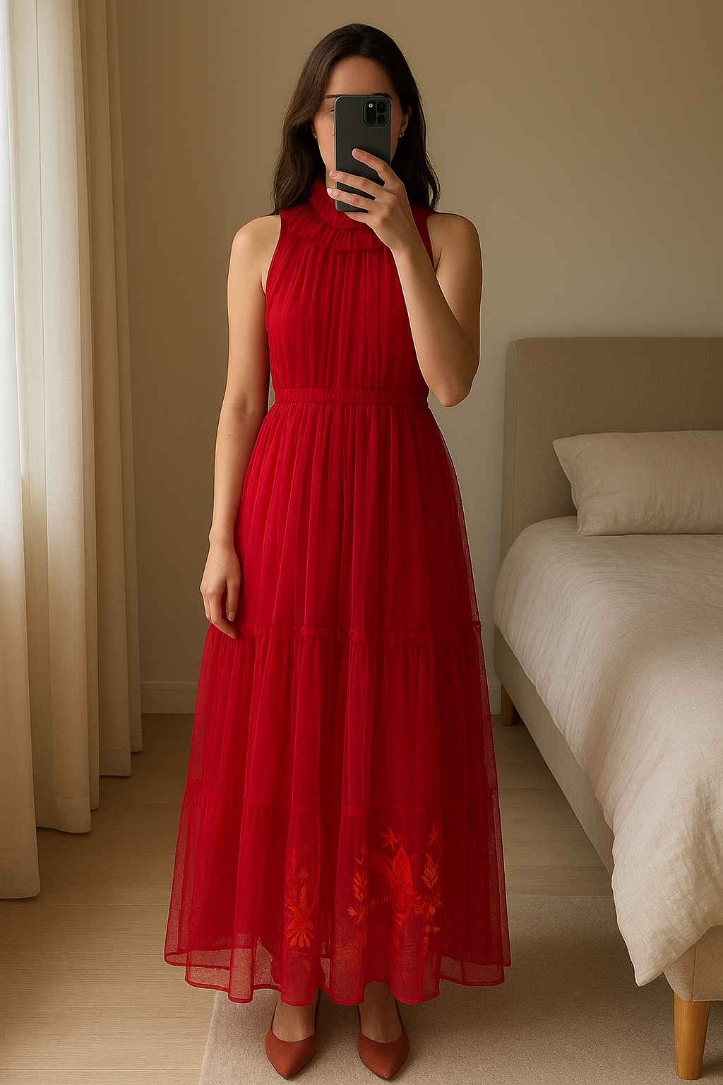 Robe CUPLÉ debout, face à la caméra, dans une chambre à la lumière douce, avec une lumière naturelle filtrant par la fenêtre.