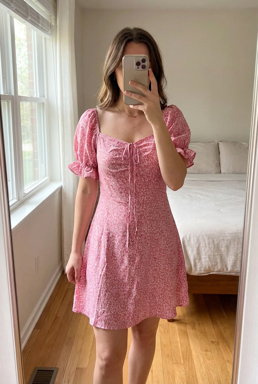 Robe d’été taille 38 debout, face à la caméra, dans une chambre à la lumière douce, avec une lumière naturelle filtrant par la fenêtre.