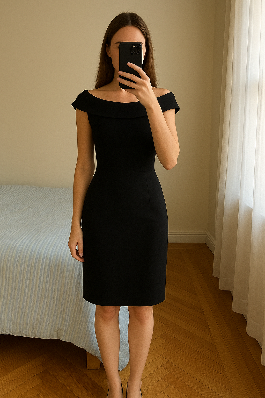 robe de cocktail encolure carmen debout, face à la caméra, dans une chambre à la lumière douce, avec une lumière naturelle filtrant par la fenêtre.