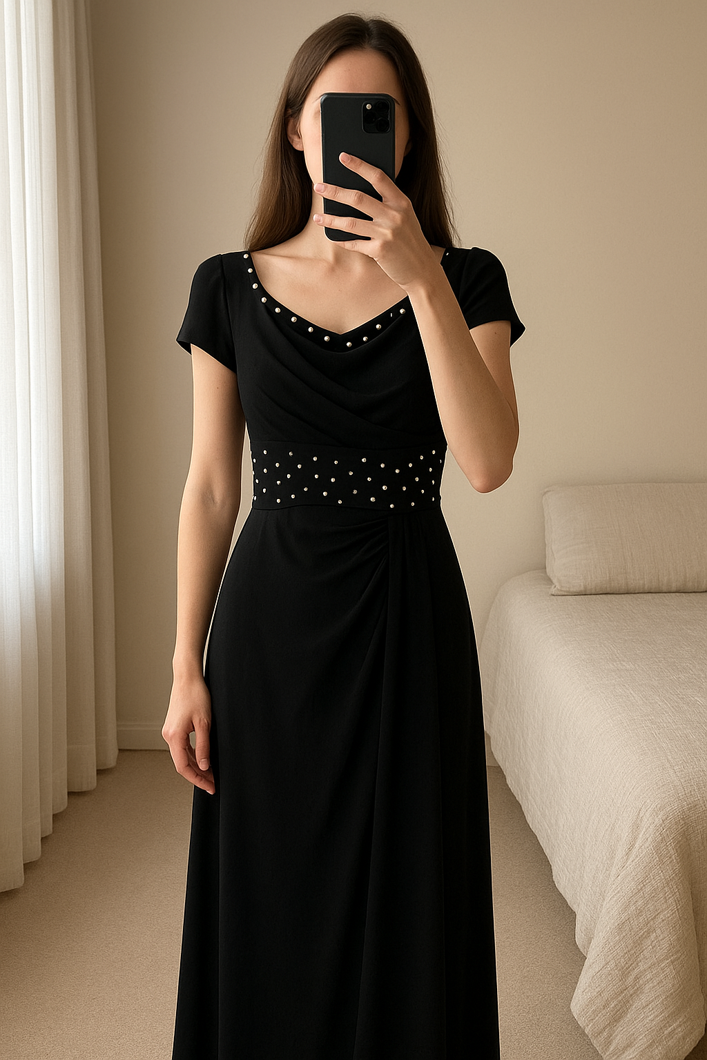 Robe de soirée noire longue debout, face à la caméra, dans une chambre à la lumière douce, avec une lumière naturelle filtrant par la fenêtre.