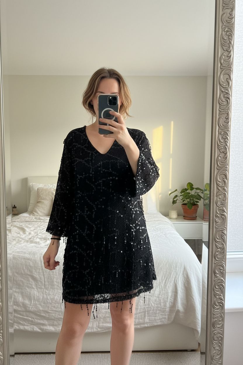 Robe de soirée noire paillette Zara debout, face à la caméra, dans une chambre à la lumière douce, avec une lumière naturelle filtrant par la fenêtre.
