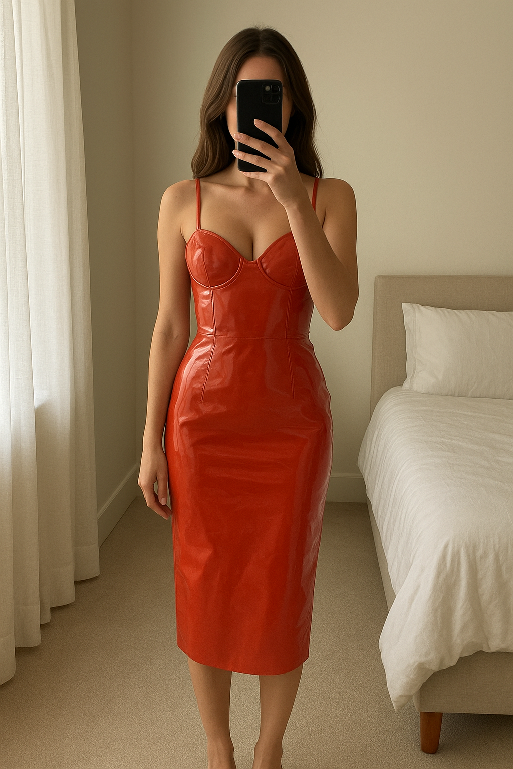 Robe de soirée Oh Polly vinyl T.10 UK debout, face à la caméra, dans une chambre à la lumière douce, avec une lumière naturelle filtrant par la fenêtre.