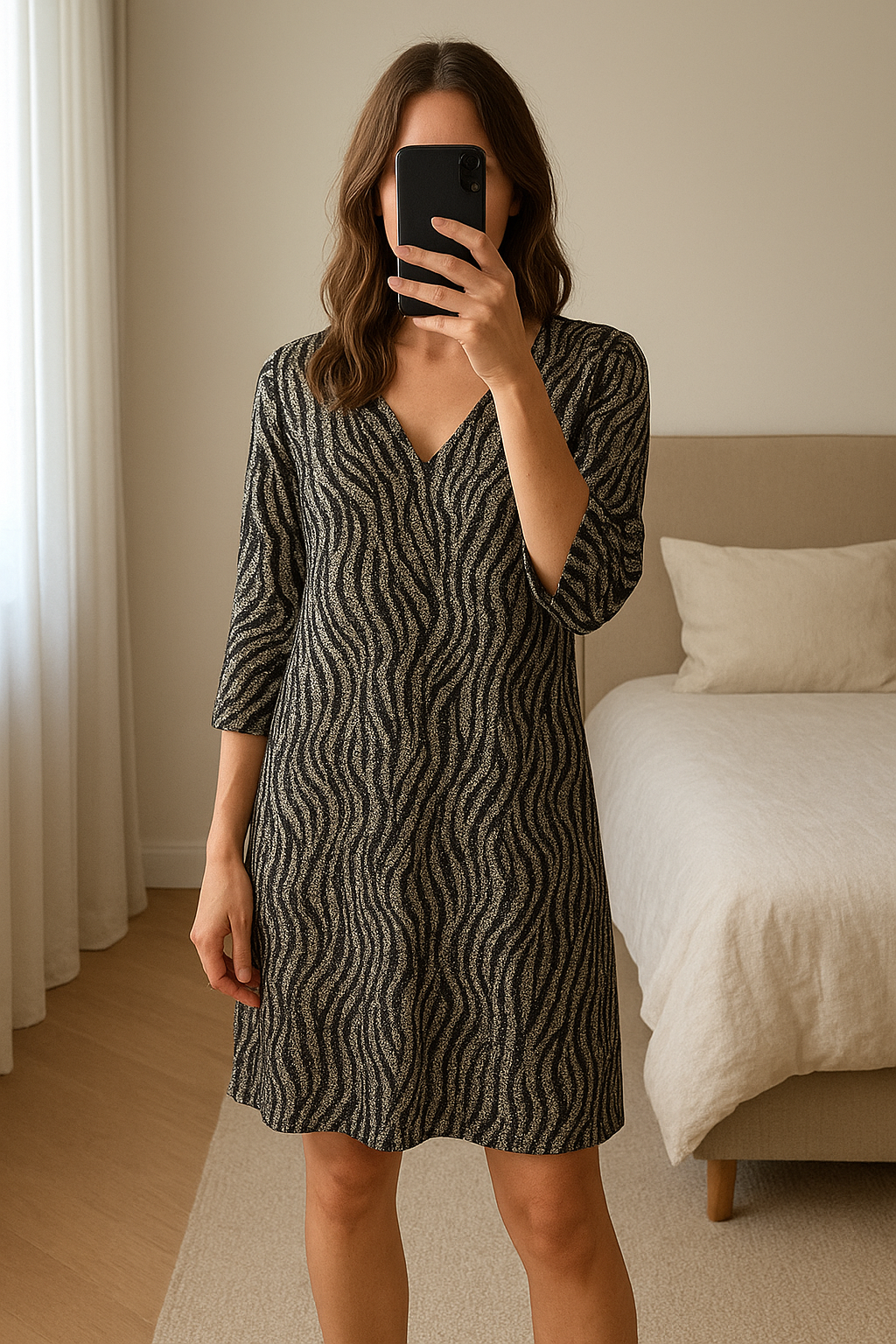 Robe de soirée zebrée et dorée debout, face à la caméra, dans une chambre à la lumière douce, avec une lumière naturelle filtrant par la fenêtre.