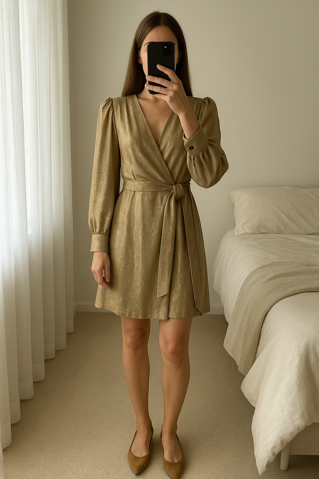 Robe dorée Easy Clothes debout, face à la caméra, dans une chambre à la lumière douce, avec une lumière naturelle filtrant par la fenêtre.