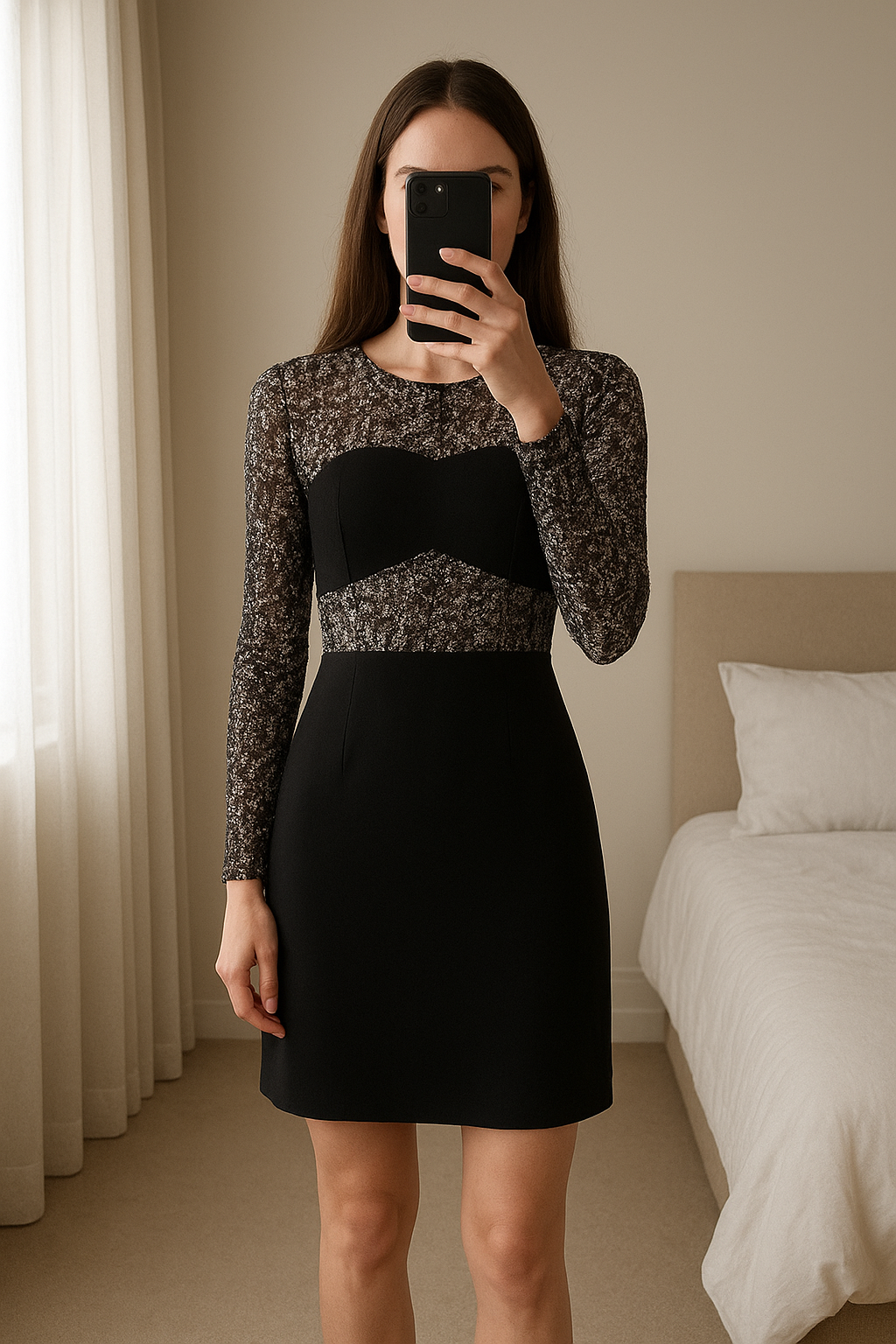 Robe fête noire argentée Taille 34 debout, face à la caméra, dans une chambre à la lumière douce, avec une lumière naturelle filtrant par la fenêtre.