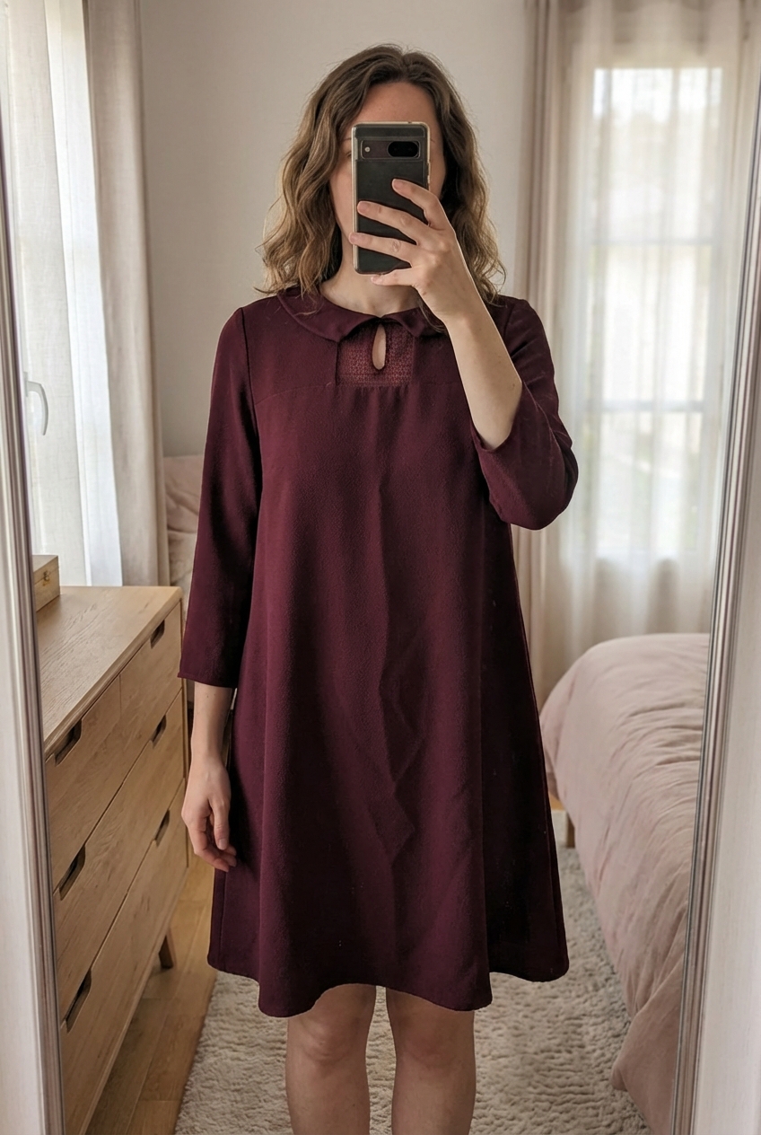 Robe fluide Comptoir des cotonniers debout, face à la caméra, dans une chambre à la lumière douce, avec une lumière naturelle filtrant par la fenêtre.