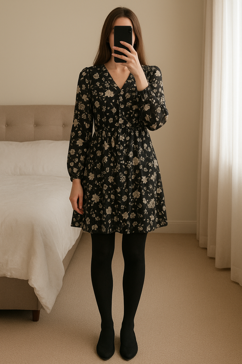 Robe fluide fleurie S/M debout, face à la caméra, dans une chambre à la lumière douce, avec une lumière naturelle filtrant par la fenêtre.