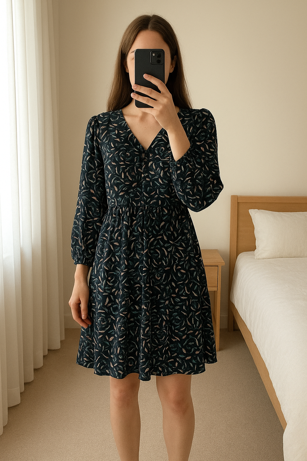 Robe fluide à motif Bonobo – Taille S debout, face à la caméra, dans une chambre à la lumière douce, avec une lumière naturelle filtrant par la fenêtre.