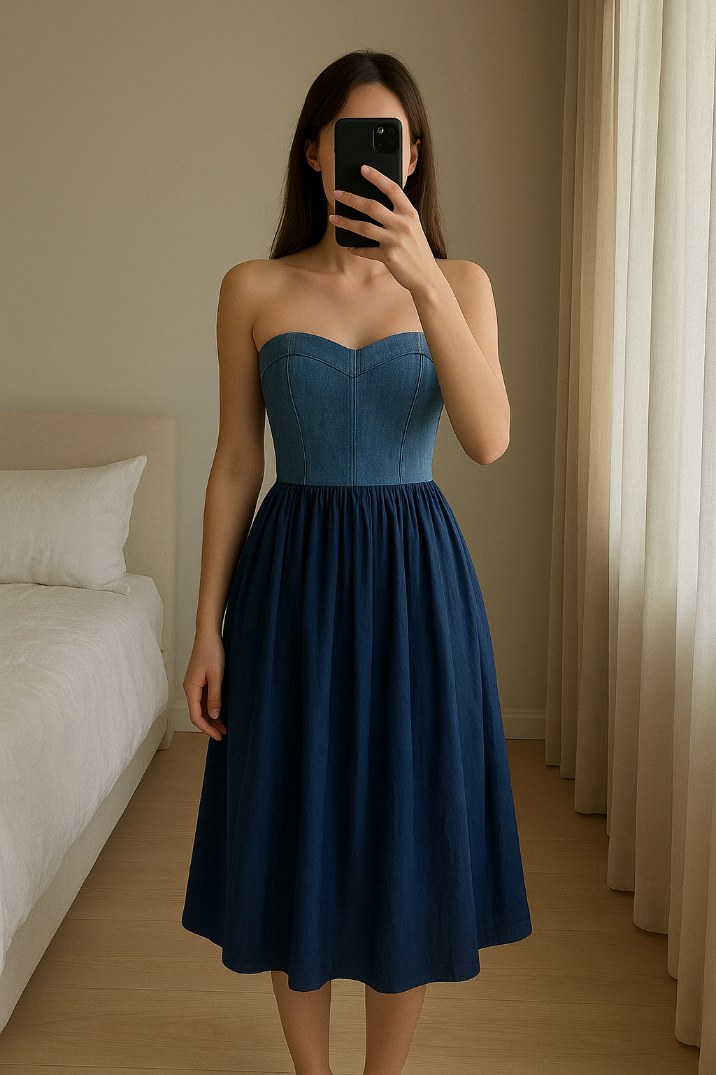 robe Hilfinger Denim femme 40 debout, face à la caméra, dans une chambre à la lumière douce, avec une lumière naturelle filtrant par la fenêtre.