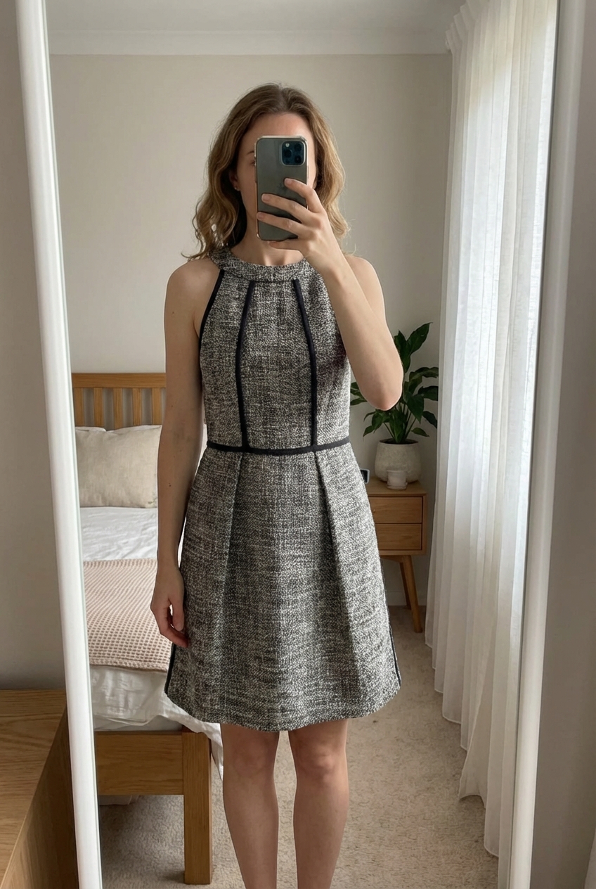 Robe Hoss Intropia – Tweed- rétro chic – T. 38 (36/38) debout, face à la caméra, dans une chambre à la lumière douce, avec une lumière naturelle filtrant par la fenêtre.