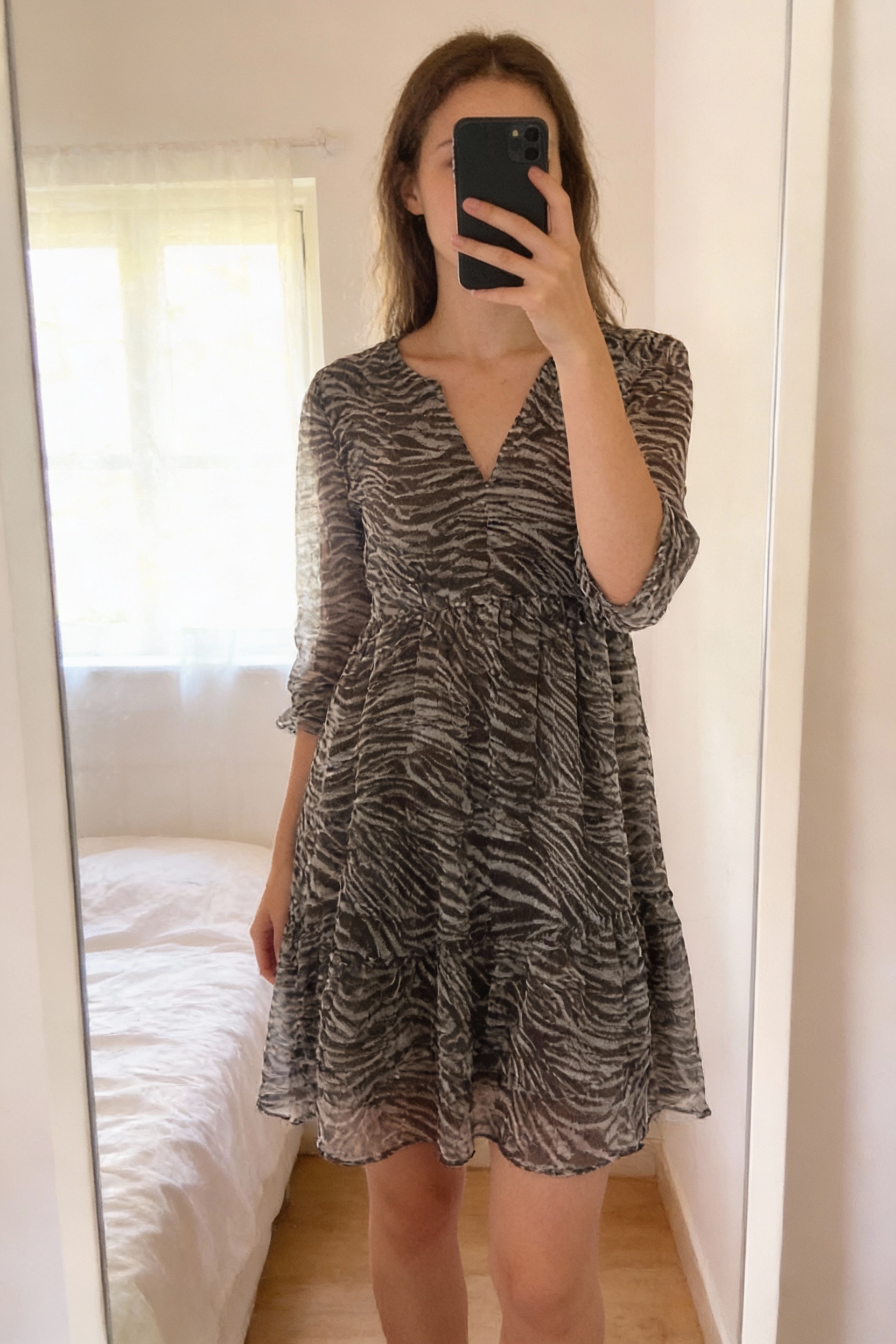Robe léopard promod debout, face à la caméra, dans une chambre à la lumière douce, avec une lumière naturelle filtrant par la fenêtre.