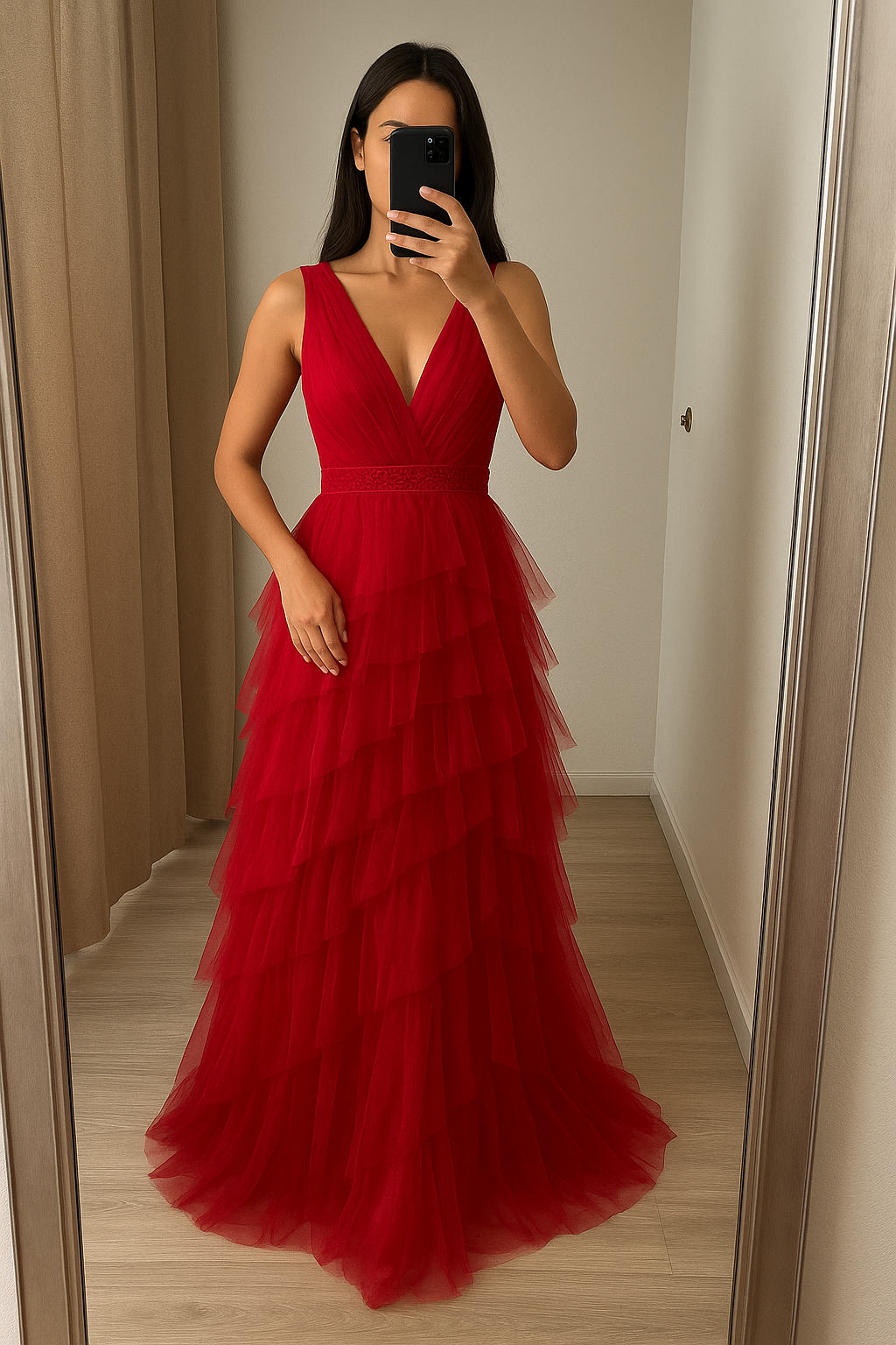 Une personne en Robe longue rose BCBG Maxazria cambrant légèrement le dos pour une pose dynamique, avec une silhouette fine, dans une cabine d’essayage de style boutique avec un miroir et une décoration neutre.