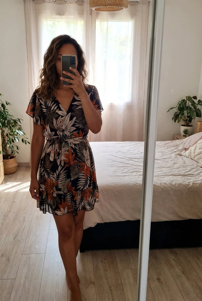 Une personne en Robe Mango motifs automnales taille 36/38 - Neuve debout, face à la caméra, dans une chambre à la lumière douce, avec une lumière naturelle filtrant par la fenêtre.