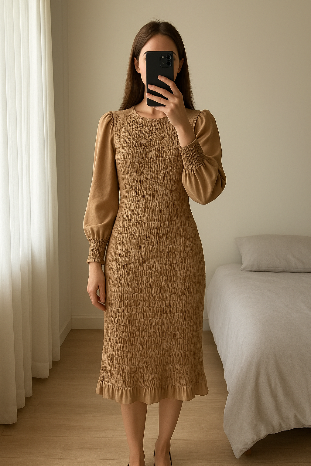 Robe marron debout, face à la caméra, dans une chambre à la lumière douce, avec une lumière naturelle filtrant par la fenêtre.