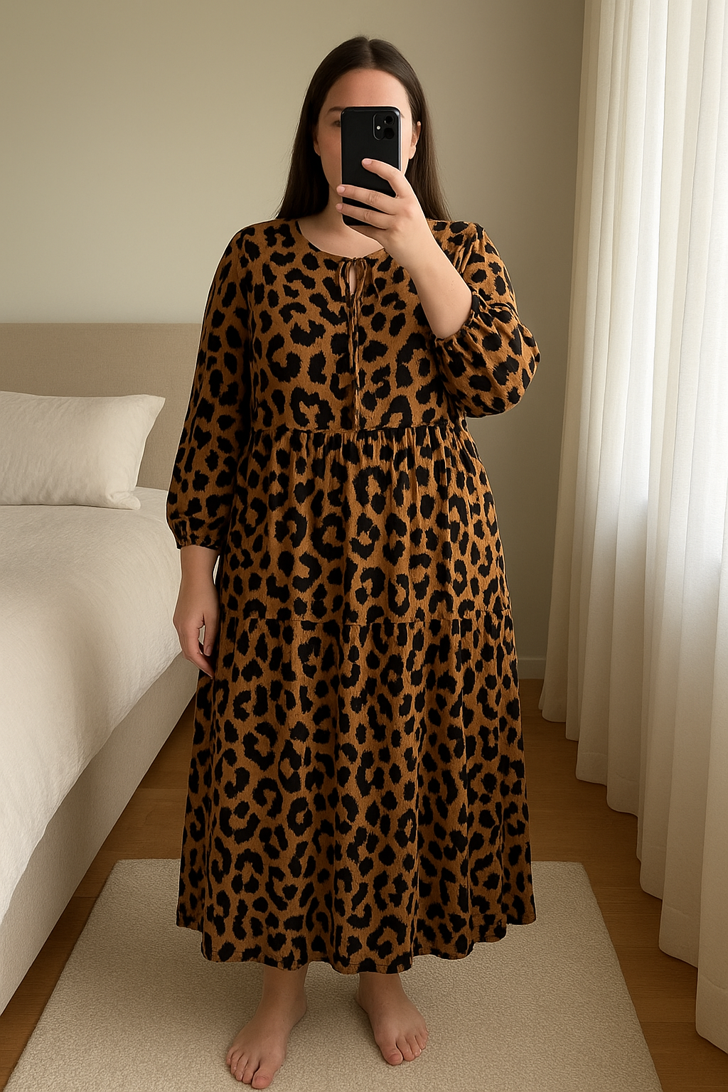 Une personne en Robe maxi léopard debout, face à la caméra, avec une silhouette légèrement plus ronde, dans une chambre à la lumière douce, avec une lumière naturelle filtrant par la fenêtre.