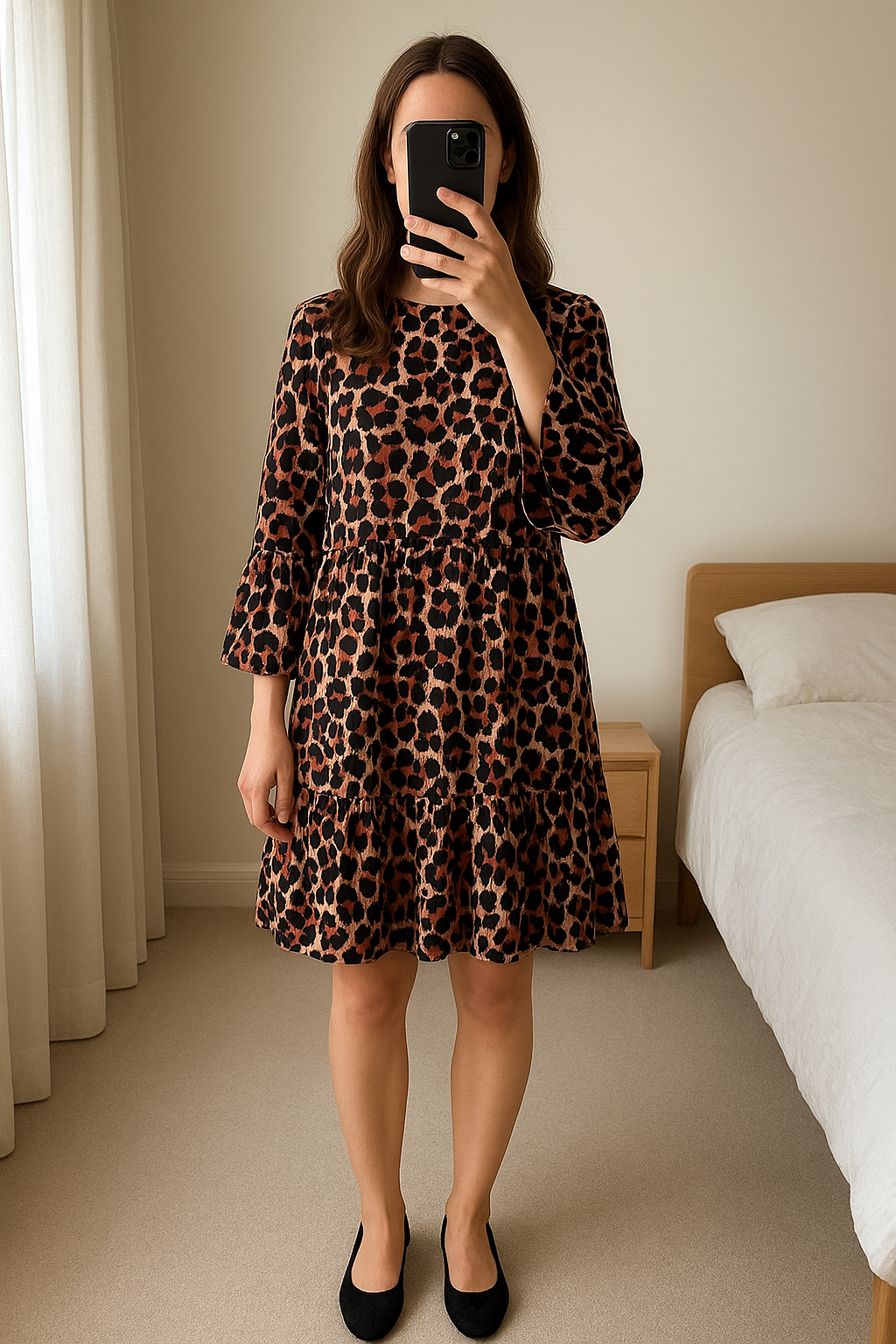 Robe à motifs Loavies – Taille XS debout, face à la caméra, dans une chambre à la lumière douce, avec une lumière naturelle filtrant par la fenêtre.