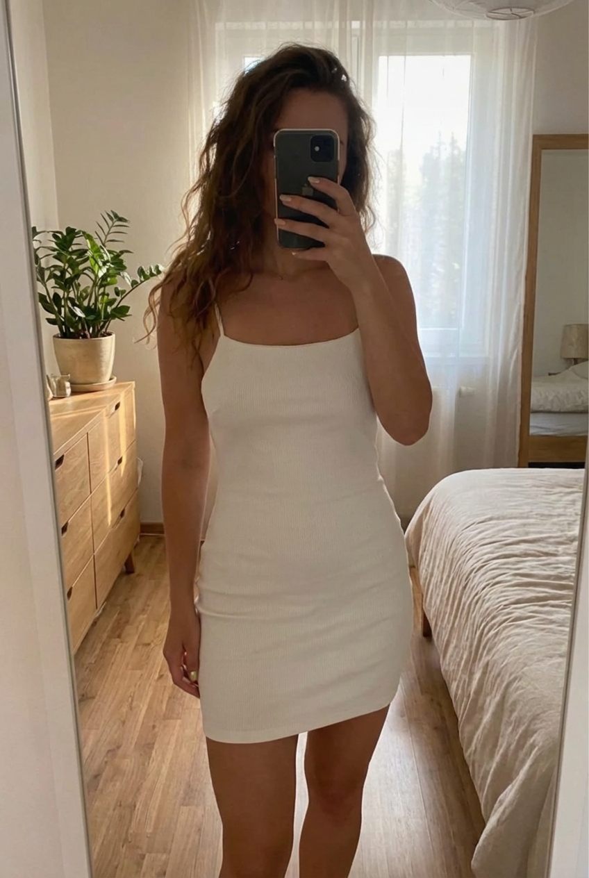 Robe moulante mango debout, face à la caméra, dans une chambre à la lumière douce, avec une lumière naturelle filtrant par la fenêtre.