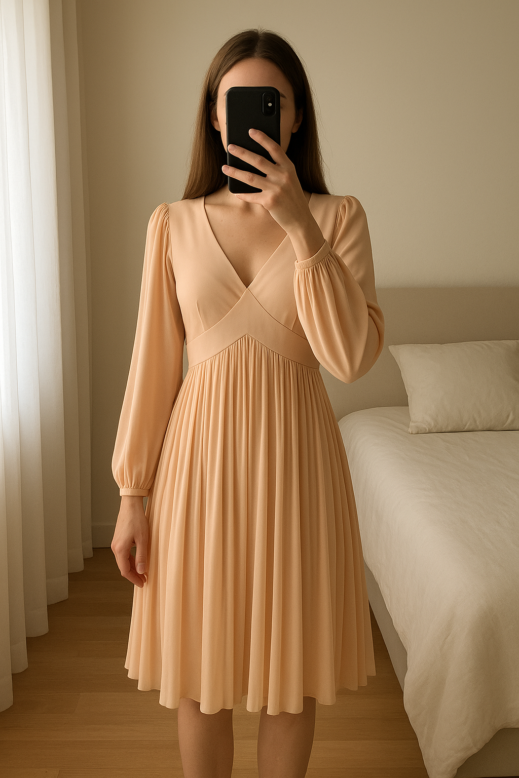 Robe NA-KD 🍃 coloris beige debout, face à la caméra, dans une chambre à la lumière douce, avec une lumière naturelle filtrant par la fenêtre.