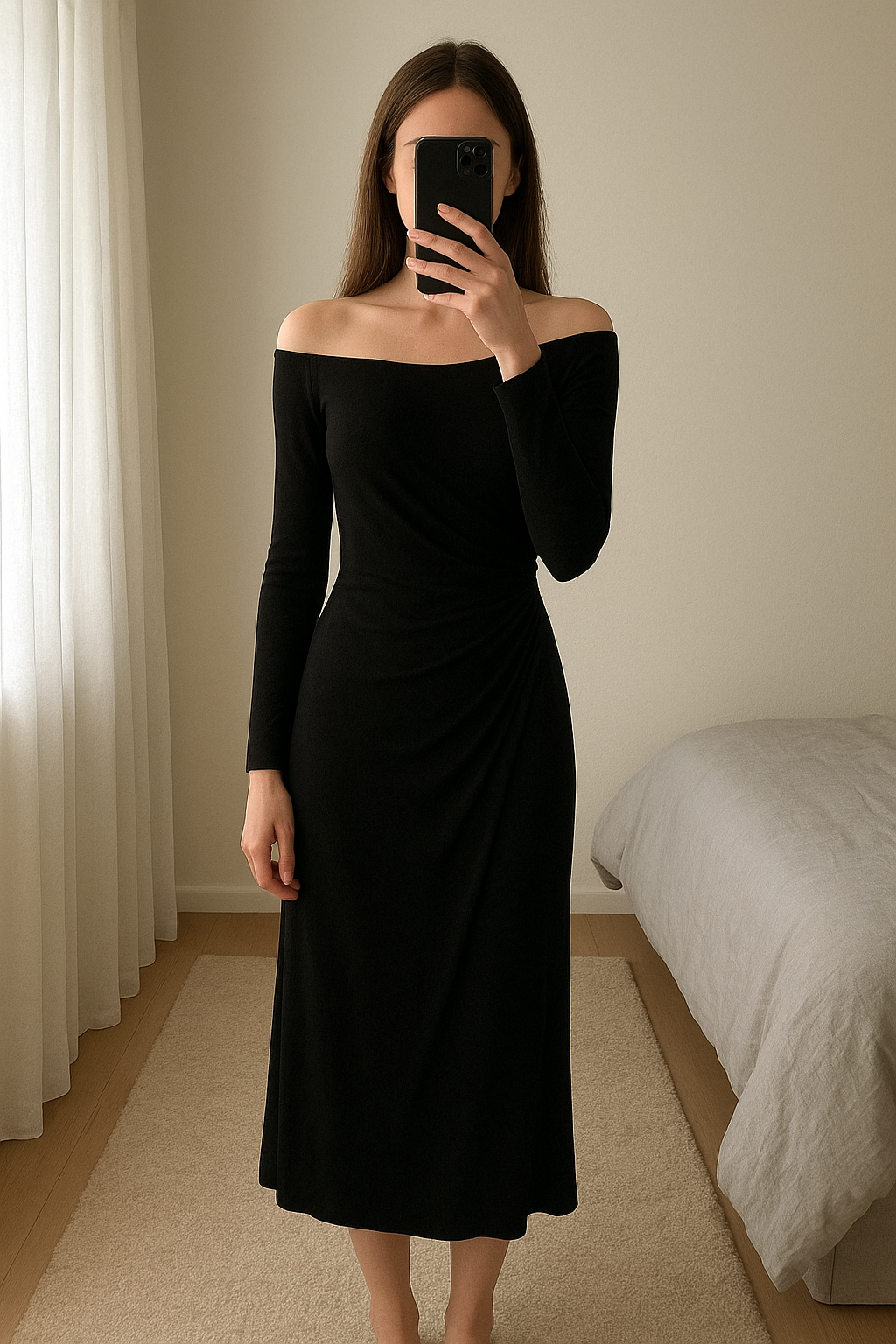 robe noire avec drapé devant debout, face à la caméra, dans une chambre à la lumière douce, avec une lumière naturelle filtrant par la fenêtre.
