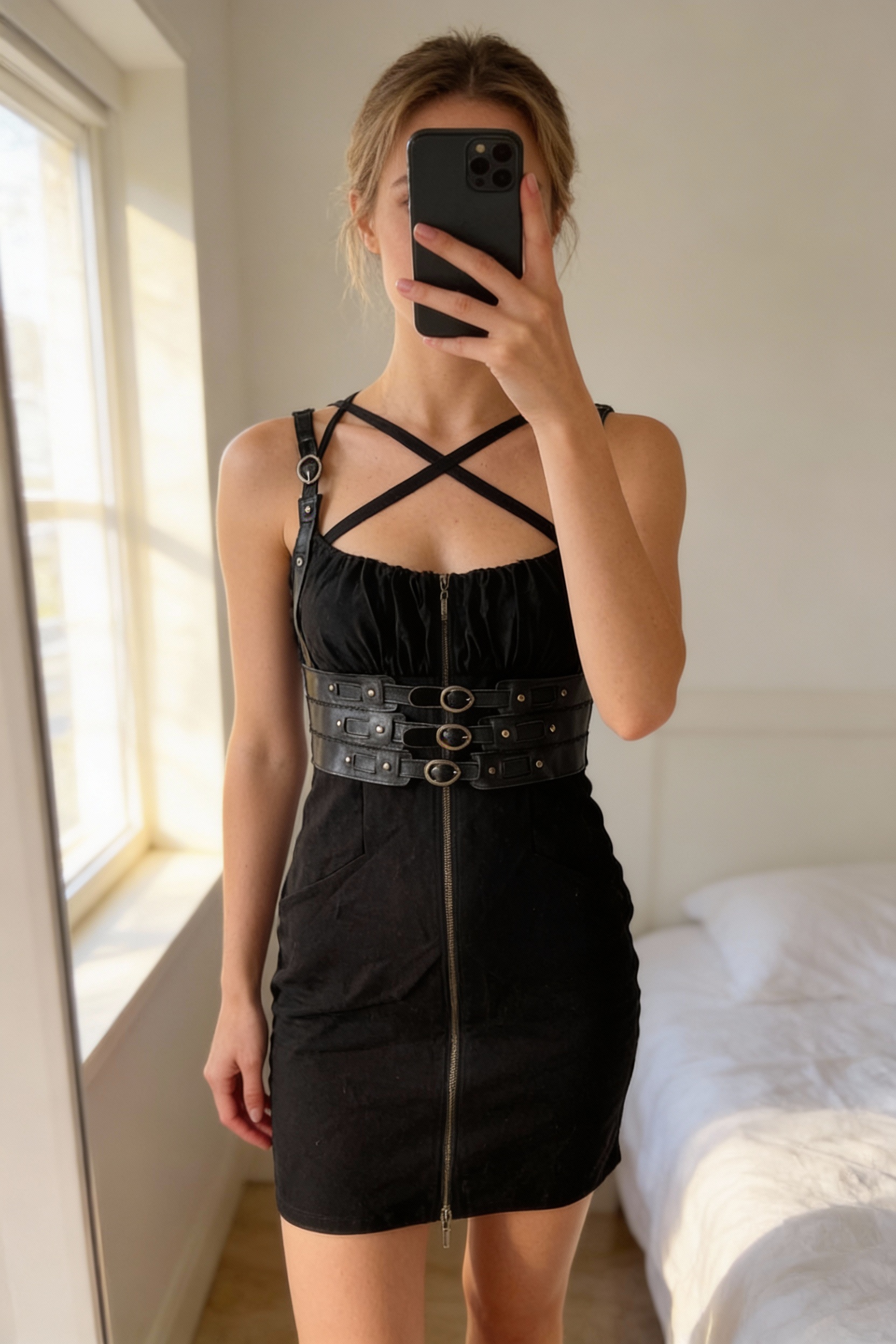 Robe noire courte MET, taille M debout, face à la caméra, dans une chambre à la lumière douce, avec une lumière naturelle filtrant par la fenêtre.