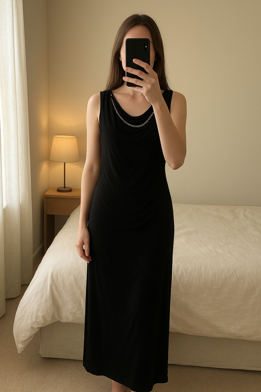 Robe Noire Élégante debout, face à la caméra, dans une chambre à la lumière douce, avec une lumière naturelle filtrant par la fenêtre.