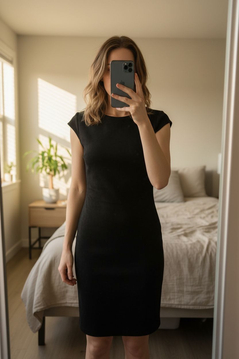 🖤 Robe noire Pronto Moda effet daim debout, face à la caméra, dans une chambre à la lumière douce, avec une lumière naturelle filtrant par la fenêtre.