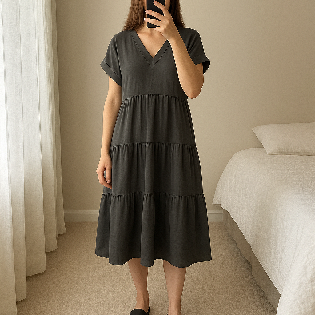 Robe Noire à Volants debout, face à la caméra, dans une chambre à la lumière douce, avec une lumière naturelle filtrant par la fenêtre.