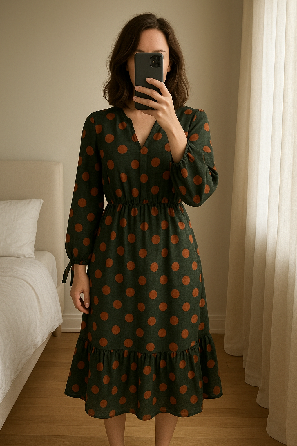 Robe à pois Only🍃 debout, face à la caméra, dans une chambre à la lumière douce, avec une lumière naturelle filtrant par la fenêtre.