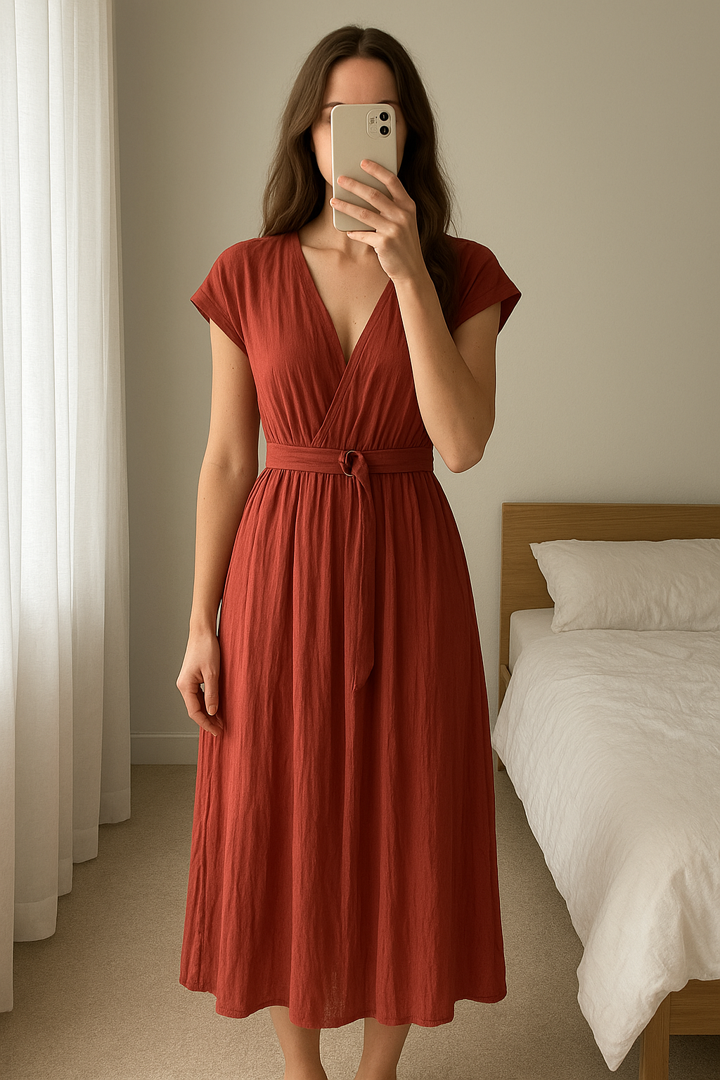 Robe promod neuve debout, face à la caméra, dans une chambre à la lumière douce, avec une lumière naturelle filtrant par la fenêtre.