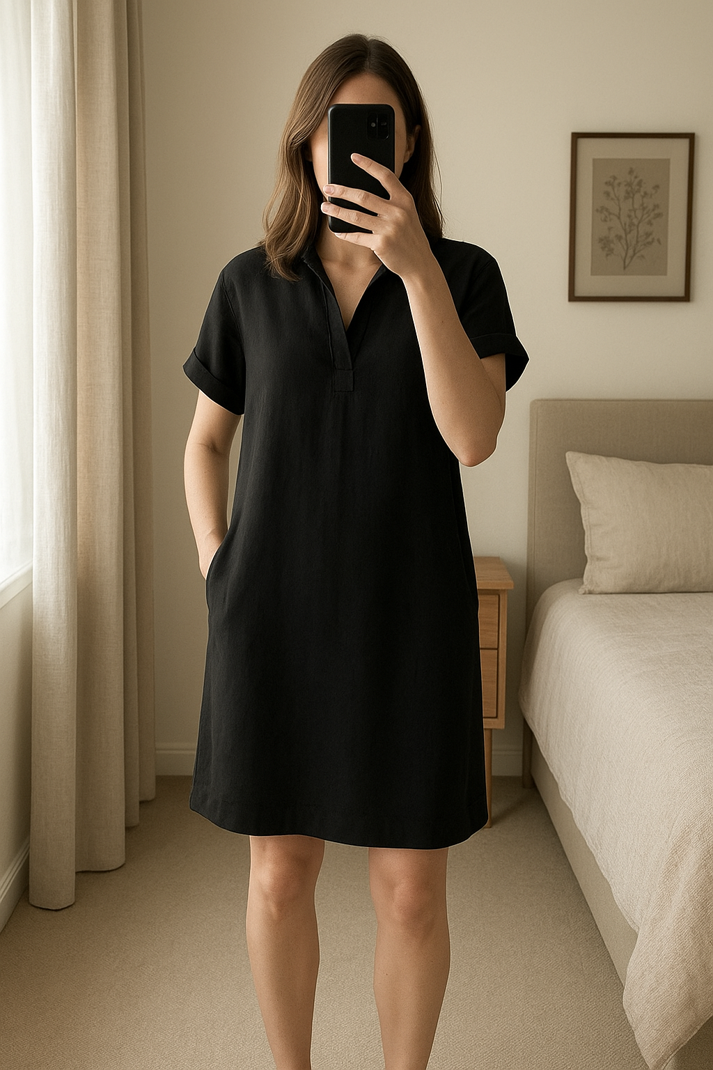 Robe promod noire debout, face à la caméra, dans une chambre à la lumière douce, avec une lumière naturelle filtrant par la fenêtre.