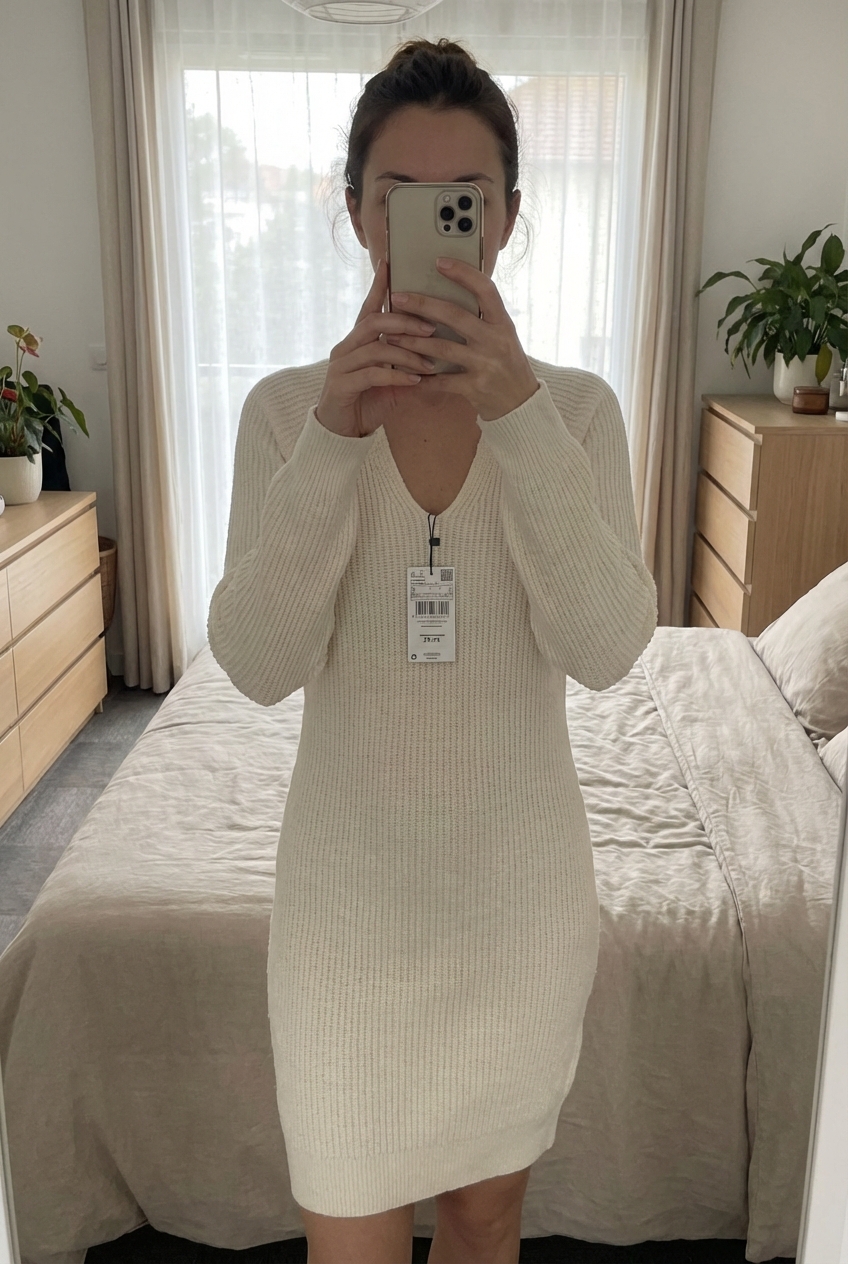 Robe pull mango écru S debout, face à la caméra, dans une chambre à la lumière douce, avec une lumière naturelle filtrant par la fenêtre.