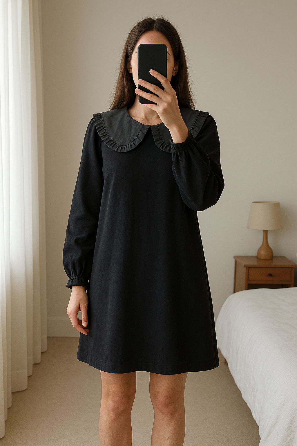 Robe rosae Paris debout, face à la caméra, dans une chambre à la lumière douce, avec une lumière naturelle filtrant par la fenêtre.
