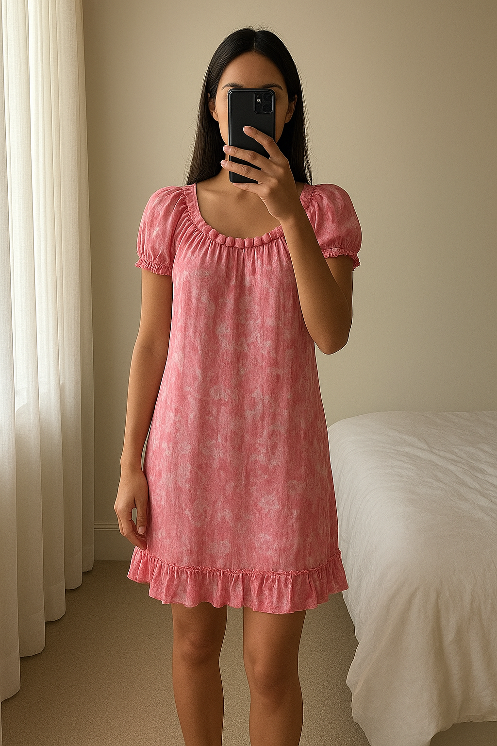Une personne en Robe rose fleuri pompons manches bouffantes volants froufrous debout, face à la caméra, dans une chambre à la lumière douce, avec une lumière naturelle filtrant par la fenêtre.