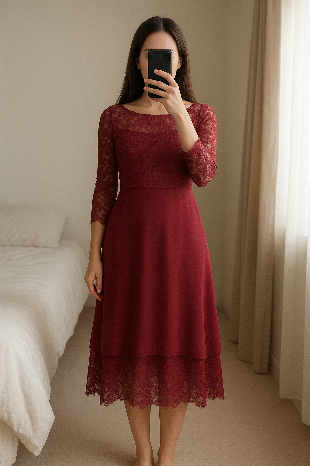 Robe rouge dentelle neuve taille L debout, face à la caméra, dans une chambre à la lumière douce, avec une lumière naturelle filtrant par la fenêtre.